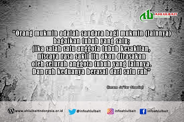 Imam Ja’far Shadiq as berkata: “Orang mukmin adalah saudara bagi mukmin (lainnya) bagaikan tubuh yang satu; jika salah satu anggota tubuh kesakitan, niscaya rasa sakit itu...