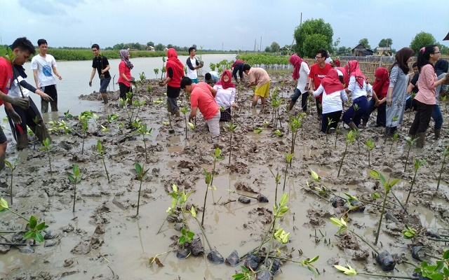 Para pecinta alam yang tergabung dalam komunitas Sekolah Anak Bahari (SAB) menyelenggarakan tanam mangrove di Desa Patra Manggala, Tangerang, Sabtu (11/2/17). Tujuan utama tanam mangrove ini...