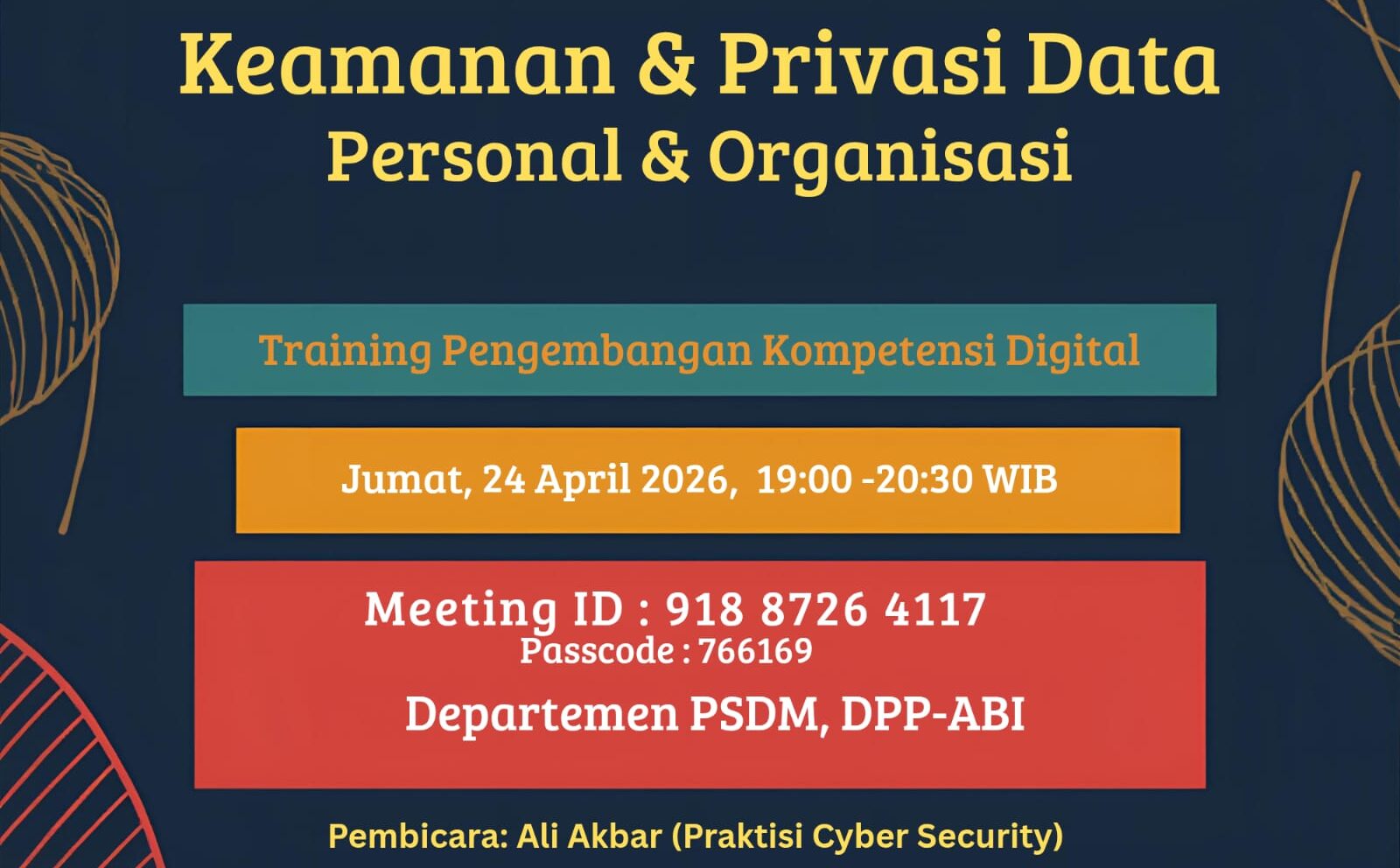 Mengacu pada kebutuhan perlindungan data yang kian mendesak, pelatihan ini mengangkat tema Keamanan dan Privasi Data Personal dan Organisasi. Kegiatan berlangsung secara daring melalui Zoom pukul 19.00 hingga 20.30 WIB.
