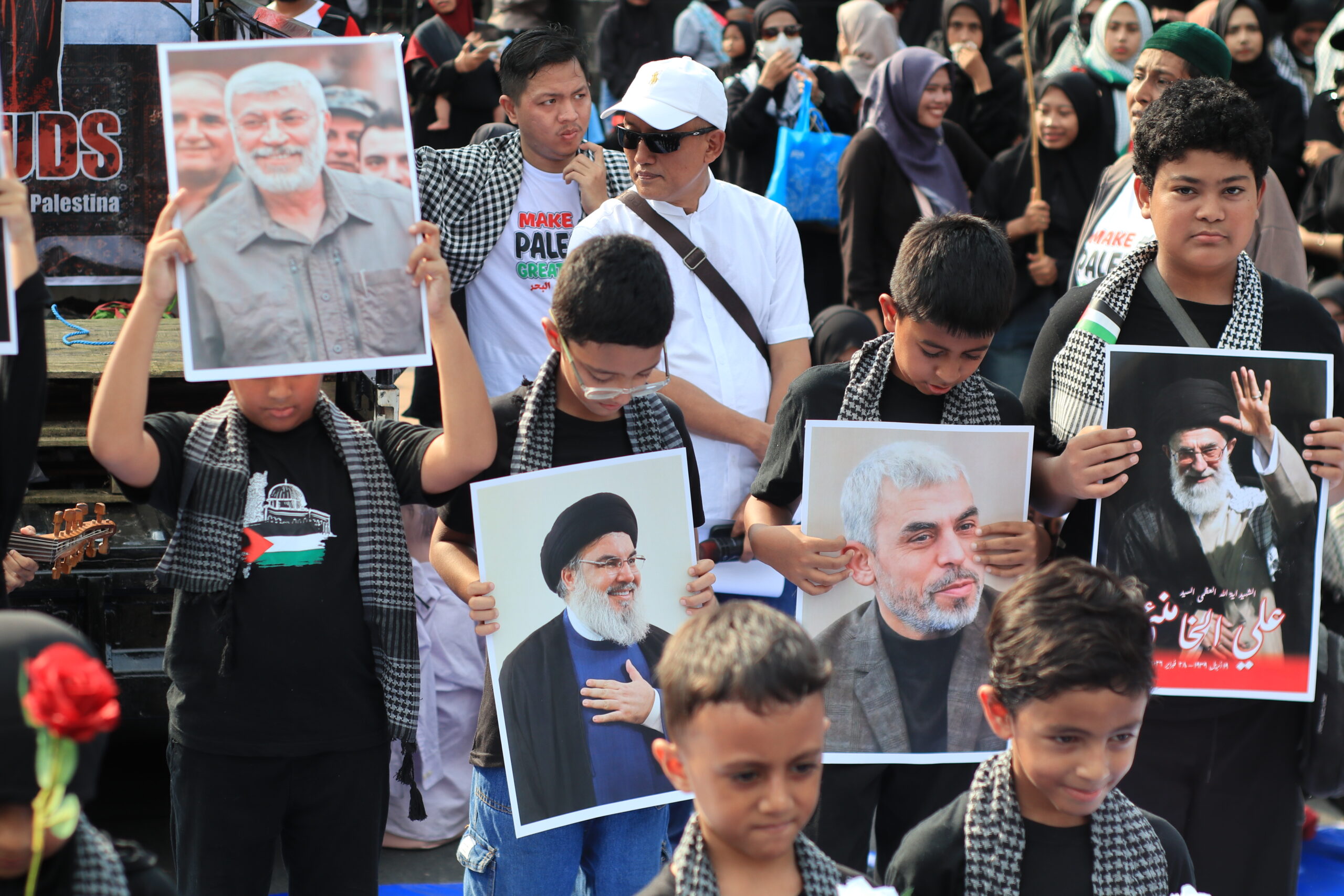 Hijau, merah, putih, dan hitam, warna Palestina bercampur dengan merah putih Indonesia. Di antara poster-poster tersebut juga tampak gambar-gambar para syuhada yang dibawa oleh anak-anak, ibu-ibu, orang tua, dan para remaja. Di tangan mereka, wajah-wajah tokoh yang mereka kagumi terangkat tinggi, Sayyid Hassan Nasrallah, Qasim Soleimani, Yahya Sinwar, Ismail Haniyeh, Abu Mahdi al-Muhandis, serta para syuhada Poros Perlawanan lainnya.