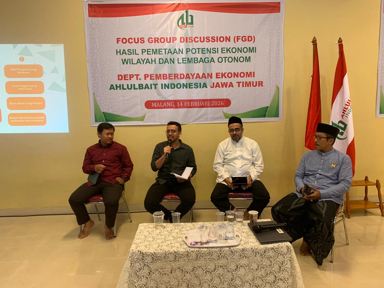 Malang, 15 Februari 2026 — Dewan Pimpinan Wilayah (DPW) Ahlulbait Indonesia (ABI) Jawa Timur menggelar Focus Group Discussion (FGD) pemberdayaan ekonomi komunitas sebagai tindak lanjut hasil Pemetaan Potensi Ekonomi Komunitas 2025, Sabtu (14/2). Kegiatan yang diselenggarakan secara hybrid ini melibatkan unsur DPW, DPD, serta lembaga otonom ABI se-Jawa Timur, dengan fokus utama merumuskan strategi penguatan ekonomi berbasis data dan kolektivitas organisasi.