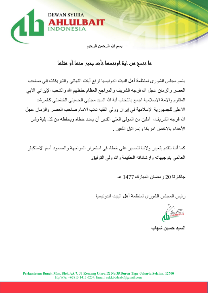 Pernyataan tersebut ditutup dengan doa agar Allah SWT melimpahkan taufik dan petunjuk dalam setiap langkah perjuangan. Pesan resmi tersebut ditandatangani oleh Ketua Dewan Syura Ahlulbait Indonesia, Ustadz Husin Shahab. []