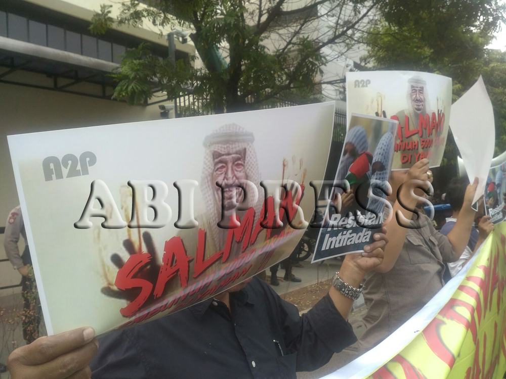 Aliansi Anti Perang (A2P) kembali mendatangi Kedubes Arab Saudi, Kamis (23/10). Mereka melakukan aksi demonstrasi damai menuntut agar Raja Saudi bertanggungjawab atas terbunuhnya ribuan jemaah haji, juga ribuan warga Yaman yang terbunuh akibat agresi Saudi.