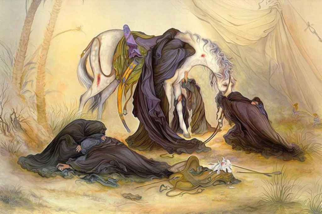 Saya yakin hampir semua orang Syiah pernah melihat atau bahkan menyimpan gambar dari lukisan mengenai peristiwa Karbala. Berlatarkan gurun panas kecoklatan dan seekor kuda putih yang sedang dipeluk oleh beberapa wanita berjubah hitam, lukisan ini selalu hadir di bulan Muharam baik menjadi latar sebuah poster, t-shirt, atau sampul buku. Lukisan dengan judul asli The Evening of Ashura tersebut merupakan salah satu mahakarya Mahmoud Farshchian, seorang maestro miniatur dan lukisan Persia, yang karya-karyanya telah ditampilkan di berbagai museum dan pameran dunia.