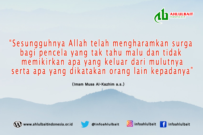 “Sesungguhnya Allah telah mengharamkan surga bagi pencela yang tak tahu malu dan tidak memikirkan apa yang keluar dari mulutnya serta apa yang dikatakan orang lain kepadanya.” (Imam Musa Al-Kazhim a.s.)