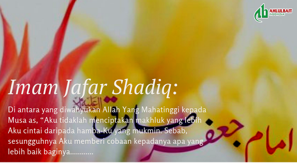 Imam Shadiq as berkata: Di antara yang diwahyukan Allah Yang Mahatinggi kepada Musa as, “Aku tidaklah menciptakan makhluk yang lebih Aku cintai daripada hamba-Ku yang mukmin. Sebab, sesungguhnya Aku memberi cobaan kepadanya apa yang lebih baik baginya, Aku bebaskan dia dari cobaan apa yang lebih baik baginya, dan Aku cegah darinya apa yang lebih baik baginya, dan Aku lebih mengetahui dengan apa yang lebih baik bagi hamba-Ku. Oleh karena itu, hendaklah hambaKu bersabar terhadap cobaan-Ku, mensyukuri nikmat-Ku, dan ridha terhadap ketetapan-Ku, niscaya Aku tulis dia dalam golongan ash-Shiddiqin (orang-orang yang amat teguh keyakinannya kepada kebenaran Rasul) di sisi-Ku.”