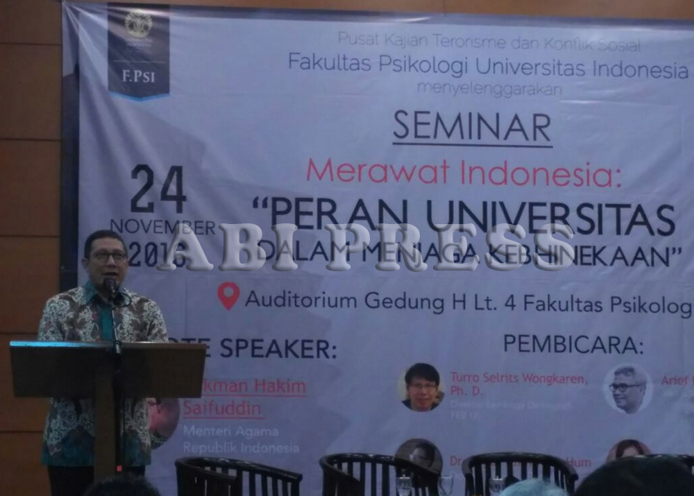 Kamis, (24/11) Pusat Kajian Terorisme dan Konflik Sosial Fakultas Psikologi Universitas Indonesia menyelenggarakan Seminar yang mengambil tema “Peran Universitas dalam Kebhinekaan” di Auditorium Fakultas Psikologi Universitas Indonesia, Depok.