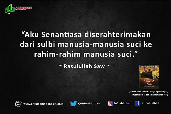 Berita Nabi yang Suci Published 8 tahun ago on 3 Maret, 2018 By Ahlulbait Indonesia Rasulullah saw. bersabda, ” Aku senantiasa diserahterimakan dari sulbi manusia-manusia suci ke rahim-rahim manusia suci.” (Sumber – Manusia Suci: Biografi Singkat; Mutiara Hikmah; dan Adab Menziarahinya) Related Topics:NabiSuci Up Next ABI Rescue Bantu Perbaiki Pondok Pesantren di Depok Jawa Barat Don't Miss Sedekah Makanan Muslimah ABI Sulawesi Selatan Continue Reading You may like Jangan Menerima Kebenaran Hanya Karena Populer Hikmah dan Kehidupan Imam Muhammad Baqir Ibadah: Naluri Sempurna dan Indah Jihad dan Perjuangan Nabi Muhammad Cara Terbaik Mengenalkan Ahlulbait Nabi Garis Hidup Sayyidah Zainab Kubra Click to comment Leave a Reply Batalkan balasanAlamat email Anda tidak akan dipublikasikan. Ruas yang wajib ditandai *Komentar * Nama * Email * Situs Web