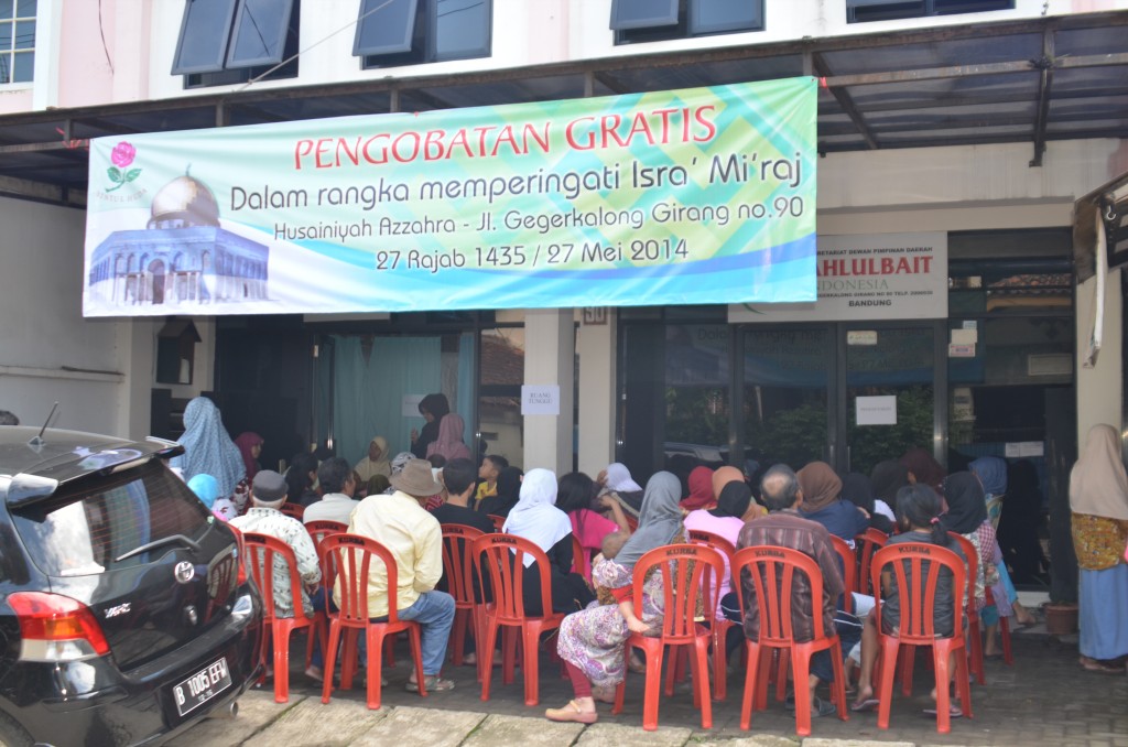 Hari ini, Selasa (27/5), bertepatan dengan 27 Rajab yang biasa diperingati sebagai hari Isra’ Mi’raj, sekelompok ibu-ibu pencinta Ahlul Bait yang tergabung dalam organisasi bernama Bintul Huda, memanfaatkan momen istimewa ini dengan melakukan kegiatan sosial berupa pengobatan gratis bagi warga sekitar di Husainiyah Azzahra, Geger Kalong Girang Bandung.
