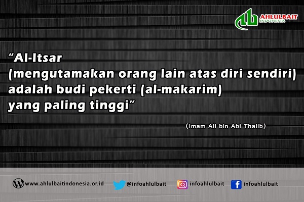 Berita Pesan Imam Ali as tentang Budi Pekerti Published 8 tahun ago on 22 September, 2017 By Ahlulbait Indonesia Imam Ali as berkata: “Al-Itsar (Mengutamakan orang lain atas diri sendiri) adalah budi pekerti (al-makarim) yang peling tinggi” Related Topics:AliASBudiimamPekertiPesan Up Next Manfaat Tangisan Anak menurut Imam Jafar Shadiq Don't Miss Arahan Dewan Syura ABI Berkaitan dengan Penyelenggaraan Majelis Duka & Asyura Imam Husein AS 1439 H Continue Reading You may like Imam Hasan Mujtaba: Kelembutan Seorang Imam di Tengah Kekerasan Zaman Zuhud dan Kesederhanaan Hidup Imam Ali Ridha a.s. Keteguhan Imam Ja’far as-Shadiq: Inspirasi Abadi Perlawanan dari Madinah hingga Gaza Ajaran-Ajaran Imam Ja‘far Shadiq a.s. Serangan Mahal, Efek Murahan: Kegagalan Amerika Menaklukkan ‘Kaum Sarungan’ Imam Ali Selalu Menunggu Kesyahidannya Click to comment Leave a Reply Batalkan balasanAlamat email Anda tidak akan dipublikasikan. Ruas yang wajib ditandai *Komentar * Nama * Email * Situs Web