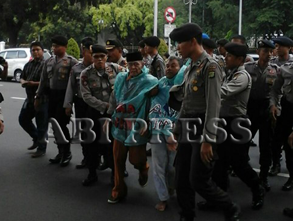 Menggunakan jas hujan bertuliskan tuntutan dan aspirasi mereka, 10 orang memulai aksi di depan Istana pukul 09.00 WIB. Tapi baru tiga menit, 200-an polisi datang dan membubarkan demo dengan menyeret pendemo ke pelataran Monas, dan kemudian diangkut ke Polres Jakarta Pusat.
