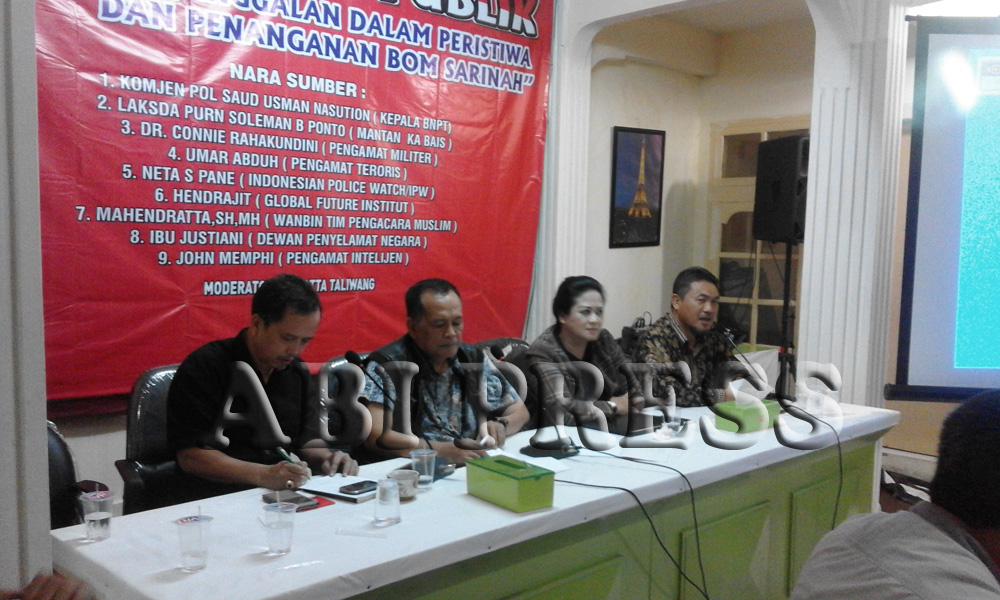Hadir juga dalam diskusi tersebut beberapa pengamat, di antaranya Pengamat Teroris Umar Abdullah, Neta S. Pane dari Indonesian Police Watch(IPW), Pengamat Intelijen John Memphi dan Pengamat Militer Dr. Connie Rahakundini. (Malik/Yudhi)