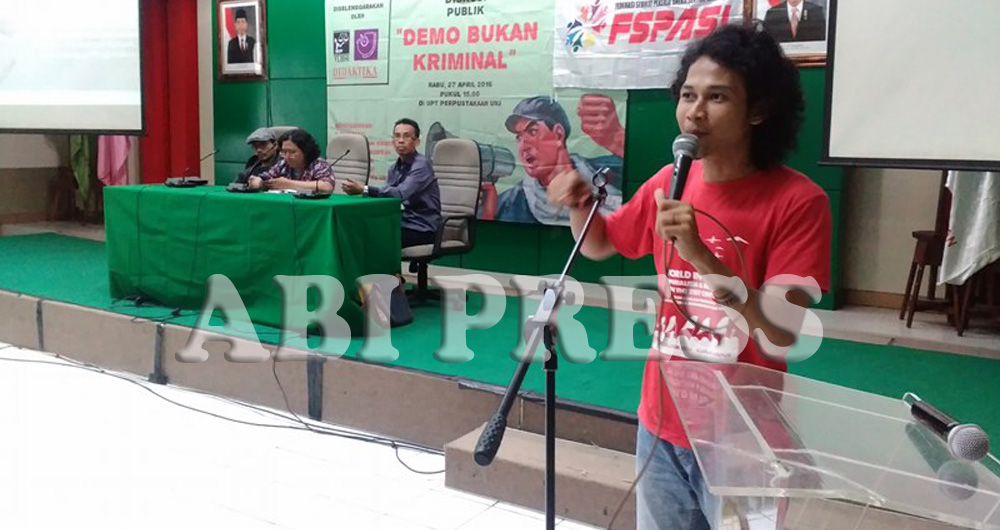 Di masa demokrasi sekarang ini, ironisnya upaya-upaya pembungkaman aspirasi rakyat kerap terulang kembali. Hal ini diungkapkan Hasyim, Ketua Federasi Mahasiswa Kerakyatan yang menjadi salah satu korban kriminalisasi aparat saat melakukan demo damai bersama buruh di depan Istana Merdeka bulan Maret lalu, dalam Diskusi Publik ‘Demo Bukan Kriminal’ di Universitas Nasional Jakarta (UNJ) Rawamangun, Jakarta Timur Rabu (27/4).