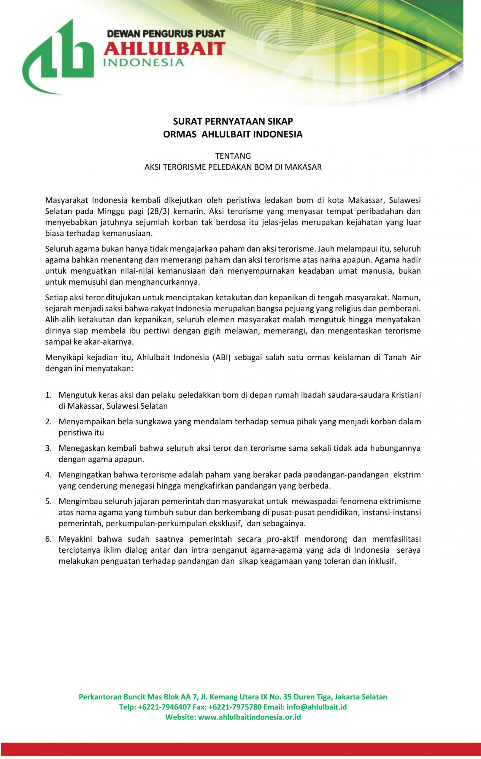 Pernyataan Sikap Ormas Ahlulbait Indonesia Terkait Aksi Terorisme Peledakkan Bom di Makassar