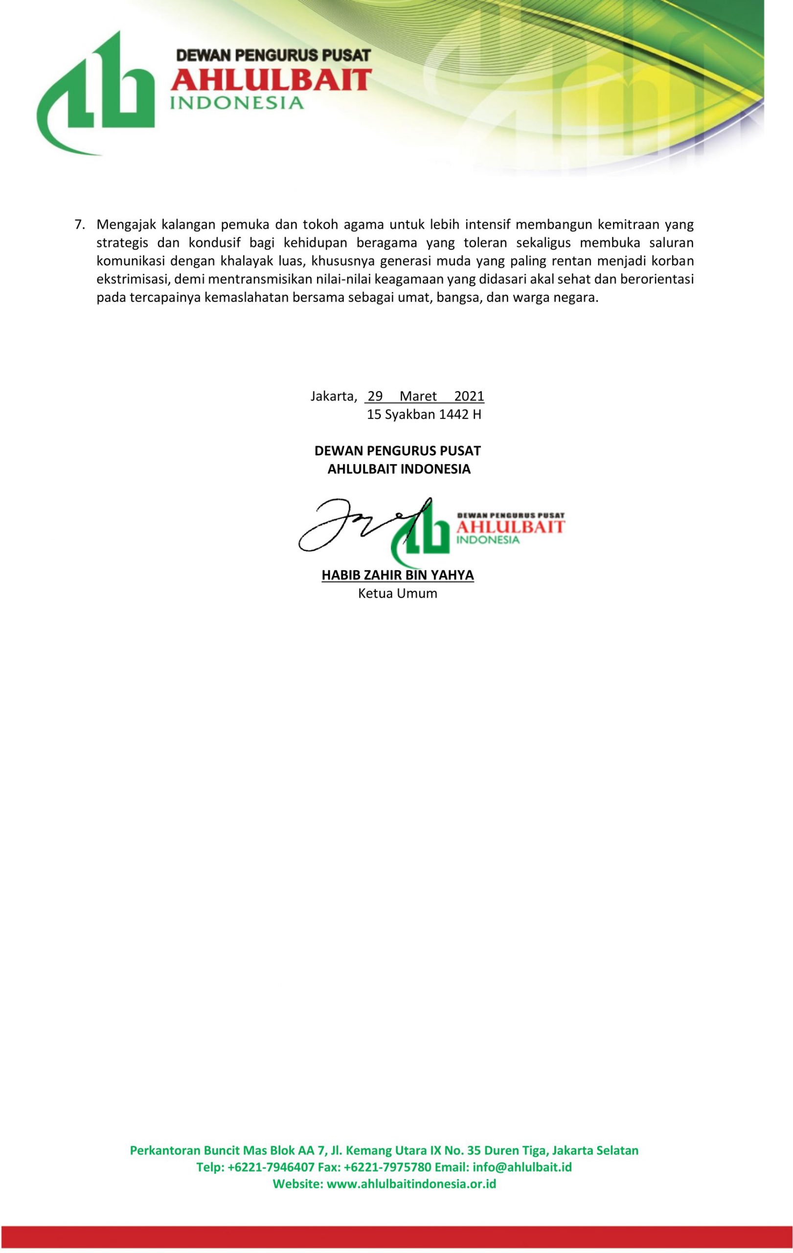- Menegaskan kembali bahwa seluruh aksi teror dan terorisme sama sekali tidak ada hubungannya dengan agama apapun.