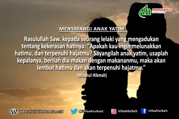 Rasulullah Saw. kepada seorang lelaki yang mengadukan tentang kekerasan hatinya: “Apakah kau ingin melunakkan hatimu, dan terpenuhi hajatmu? sayangilah anak yatim, usaplah kepalanya, berilah dia makan...