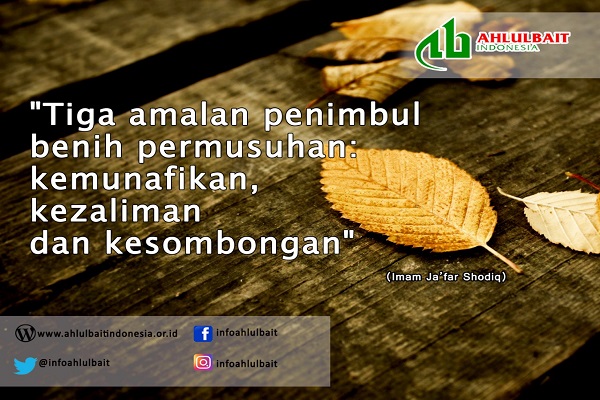 Imam Ja’far As-Shadiq as berkata: “Tiga amalan penimbul permusuhan; kemunafikan, kezaliman dan kesombongan.”