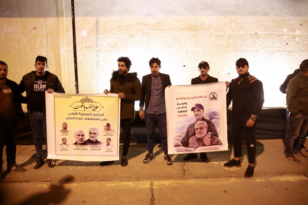 Warga Irak berkumpul di dekat bandara Baghdad pada peringatan pembunuhan Let. Jend. Iran Qassem Soleimani dan komandan Unit Mobilisasi Populer (PMU) Irak Abu Mahdi Muhandis lewat...