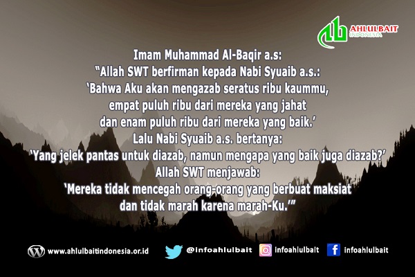 Imam Muhammad Al-Baqir a.s: “Allah SWT berfirman kepada Nabi Syuaib a.s.: ‘Bahwa Aku akan mengazab seratus ribu kaummu, empat puluh ribu dari mereka yang jahat dan...
