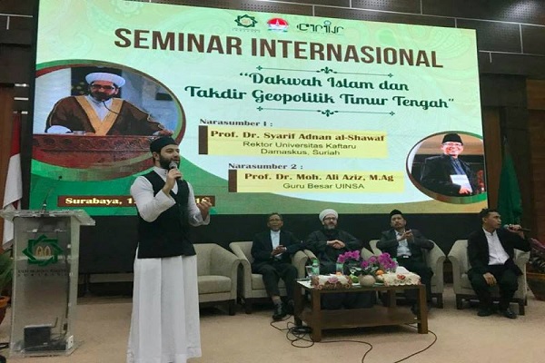 Rektor Universitas Kaftaru Damaskus Suriah (Syria), Syarif Adnan Al-Shawaf saat menjadi pembicara pada seminar internasional di Universitas Islam Negeri Sunan Ampel (UINSA) Surabaya, Senin (12/3) mendapat...