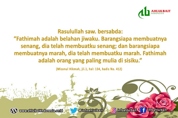Rasulullah saw. bersabda: “Fatimah adalah belahan jiwaku. Barangsiapa membuatnya senang, dia telah membuatku senang; dan barangsiapa membuatnya marah, dia telah membuatku marah. Fatimah adalah orang yang...