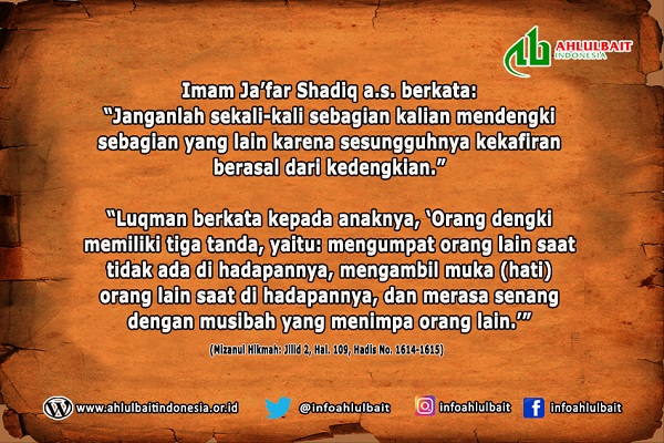 Imam Ja’far Shadiq a.s. berkata: “Janganlah sekali-kali sebagian kalian mendengki sebagian yang lain karena sesungguhnya kekafiran berasal dari kedengkian.” “Luqman berkata kepada anaknya, ‘Orang dengki memiliki...