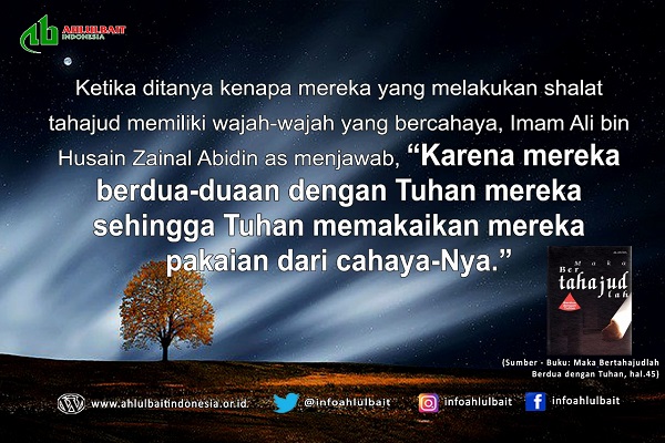 Ketika ditanya kenapa mereka yang melakukan shalat tahajud memiliki wajah-wajah yang bercahaya, Imam Ali bin Husain Zainal Abidin as menjawab, “Karena mereka berdua-duaan dengan Tuhan mereka...