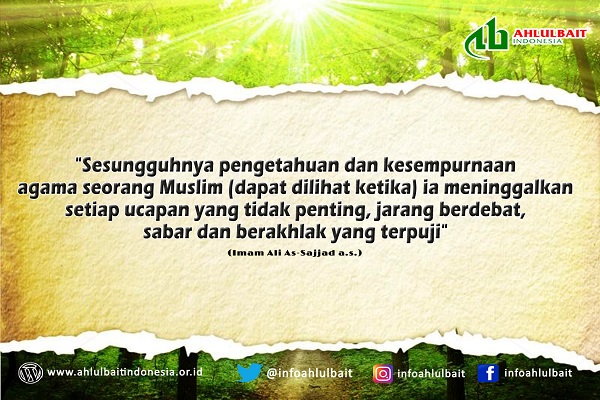 “Sesungguhnya pengetahuan dan kesempurnaan agama seorang Muslim (dapat dilihat ketika) ia meninggalkan setiap ucapan yang tidak penting, jarang berdebat, sabar dan berakhlak yang terpuji.” (Imam Ali...