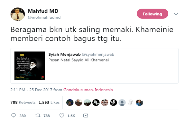 Dalam momen hari raya Natal tahun ini, Mahfud MD me-retwit sebuah twit yang mengutip pesan Natal dari Sayyid Ali Khamenei, pemimpin tertinggi Republik Islam Iran. Pada...