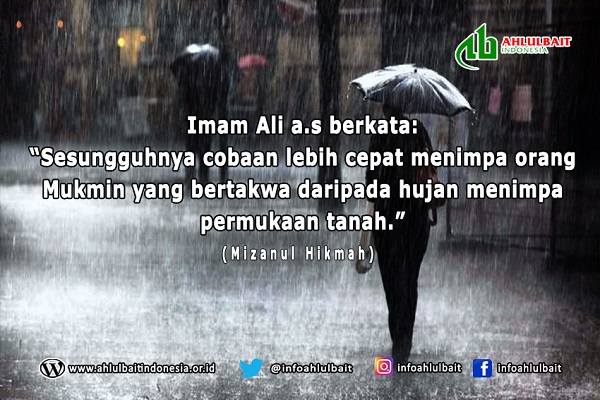 Imam Ali a.s berkata: “Sesungguhnya cobaan lebih cepat menimpa orang Mukmin yang bertakwa daripada hujan menimpa permukaan bumi.” (Mizanul Hikmah)