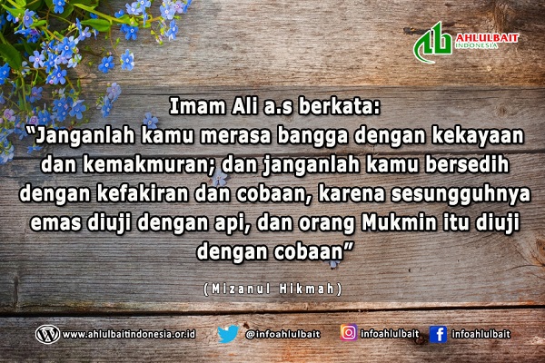Imam Ali a.s berkata: “Janganlah kamu merasa bangga dengan kekayaan dan kemakmuran; dan janganlah kamu bersedih dengan kefakiran dan cobaan, karena sesungguhnya emas diuji dengan api,...