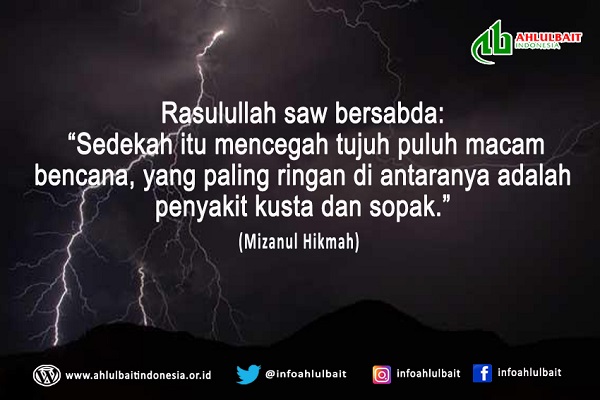Rasulullah saw bersabda: “Sedekah itu mencegah tujuh puluh macam bencana, yang paling ringan di antaranya adalah penyakit kusta dan sopak.” (Mizanul Hikmah)