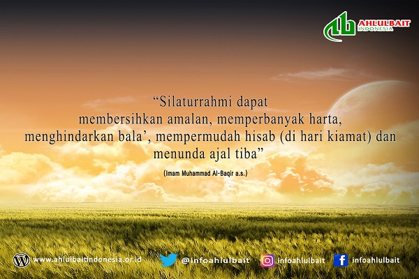 “Silaturrahmi dapat membersihkan amalan, memperbanyak harta, menghindari bala’, mempermudah hisab (di hari kiamat) dan menunda ajal tiba.” (Imam Muhammad Al-Baqir a.s.)