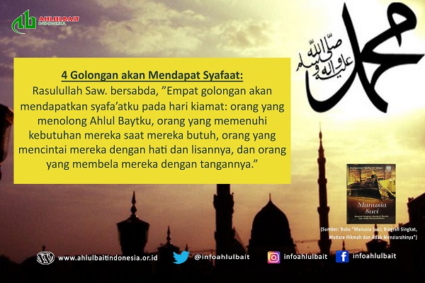Rasulullah saw. bersabda, “Empat golongan akan mendapat syafaatku pada hari kiamat: orang yang menolong Ahlul Baytku, orang yang memenuhi kebutuhan mereka saat mereka butuh, orang yang...
