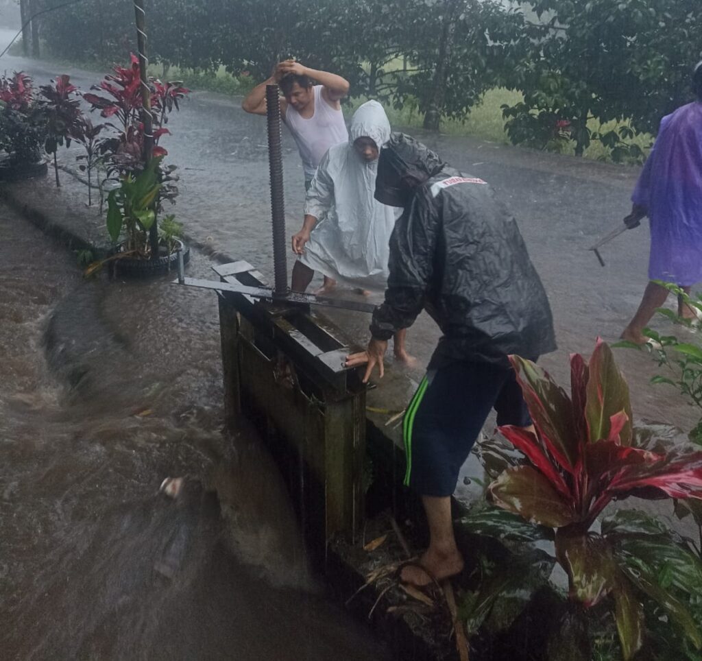 Tim turut membantu membuka pintu pembagi aliran air untuk mengurangi debit di parit yang meluap. Selain itu, tim juga meninjau lokasi longsor di belakang rumah orang tua Kepala Dusun. Berdasarkan pengamatan, longsor dipicu oleh penumpukan air hujan di sudut talut yang akhirnya roboh akibat tidak mampu menahan tekanan.