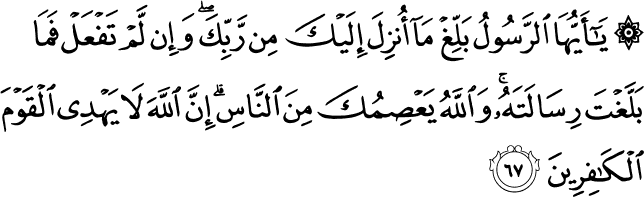 Dengan asma Allah yang Maha Pengasih dan Penyayang. Wahai Rasul, sampaikanlah (kepada manusia) apa yang telah diturunkan padamu dari Tuhanmu. Dan (ketahuilah) apabila engkau tidak melaksanakannya (masalah wilayah Ali itu), maka berarti engkau sama sekali tidak menyampaikan risalah-Nya. Dan (janganlah khawatir) Allah senantiasa menjagamu dari segala bentuk kejahatan manusia”. (QS. Al-Maidah : 67)