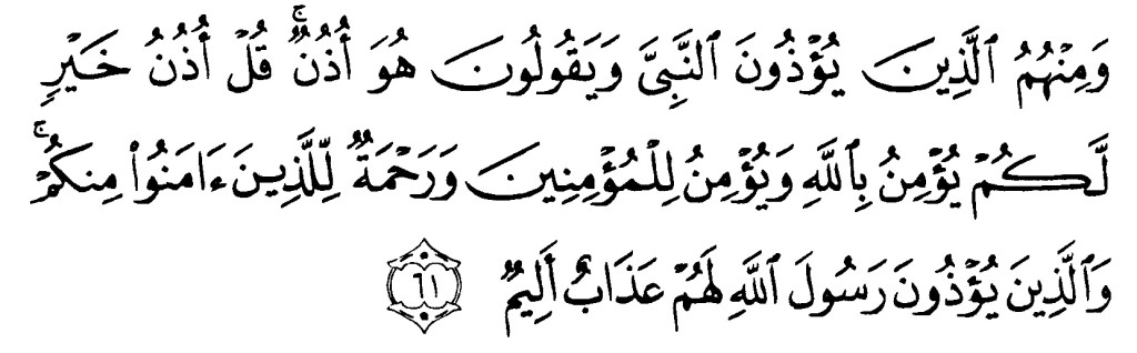 “Di antara mereka (orang-orang munafik) ada yang menyakiti Nabi Saw dan mereka mengatakan bahwa Nabi itu adalah “udzun” (mempercayai semua apa yang didengar alias gampang percaya), katakanlah (kepada mereka): ia mempercayai semua yang baik bagi kamu, ia beriman kepada Allah dan mempercayai orang-orang mukmin….”. (QS. At-Taubah : 61).