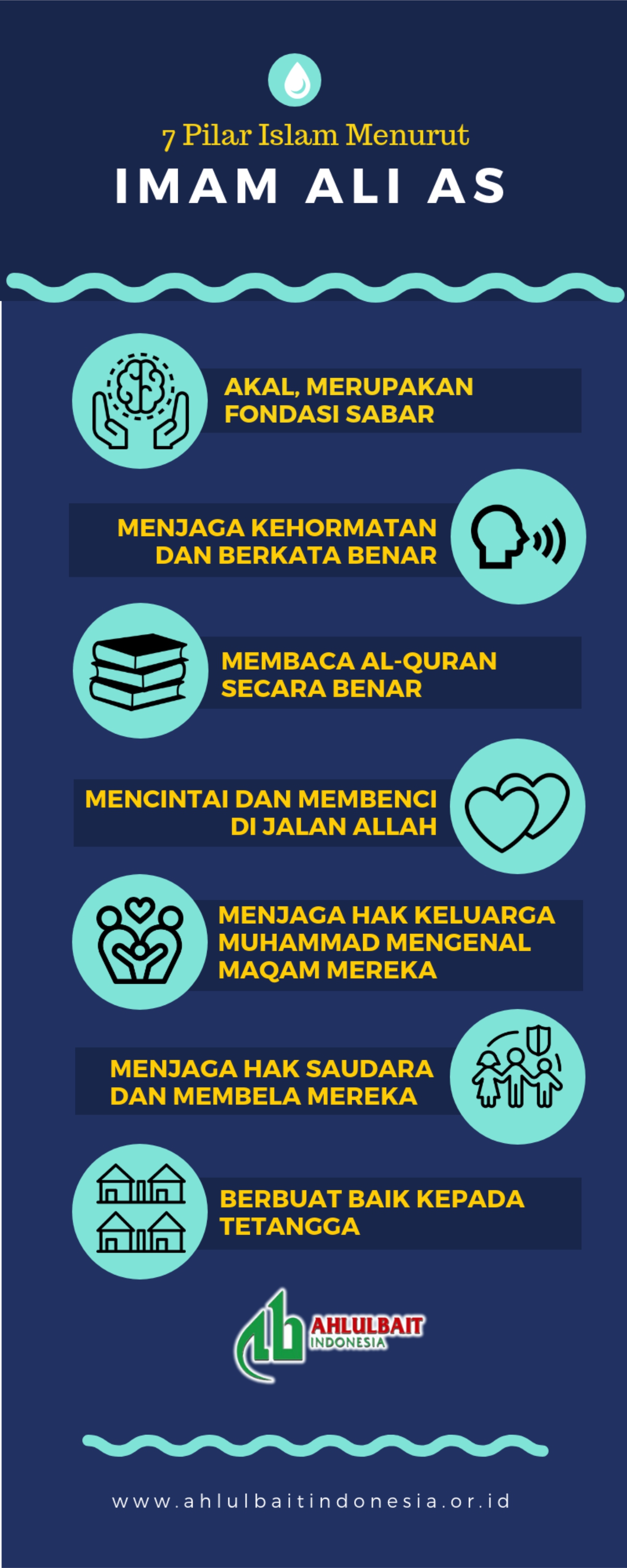 Kumail bin Ziyad berkata, ”Aku bertanya kepada Amirul Mukmin’m Ali bin Abi Thalib as tentang apa itu pilar-pilar Islam? Amirul Mukminin as menjawab, ’Pilar Islam itu ada tujuh: Pertama, akal, yang merupakan fondasi sabar. Kedua, menjaga kehormatan dan berkata benar. Ketiga, membaca al-Quran secara benar. Keempat, mencintai dan membenci di jalan Allah. Kelima, menjaga hak keluarga Muhammad dan mengenal maqam kepemimpinan mereka. Keenam, menjaga hak saudara dan membela mereka. Ketujuh, berbuat baik kepada tetangga.’
