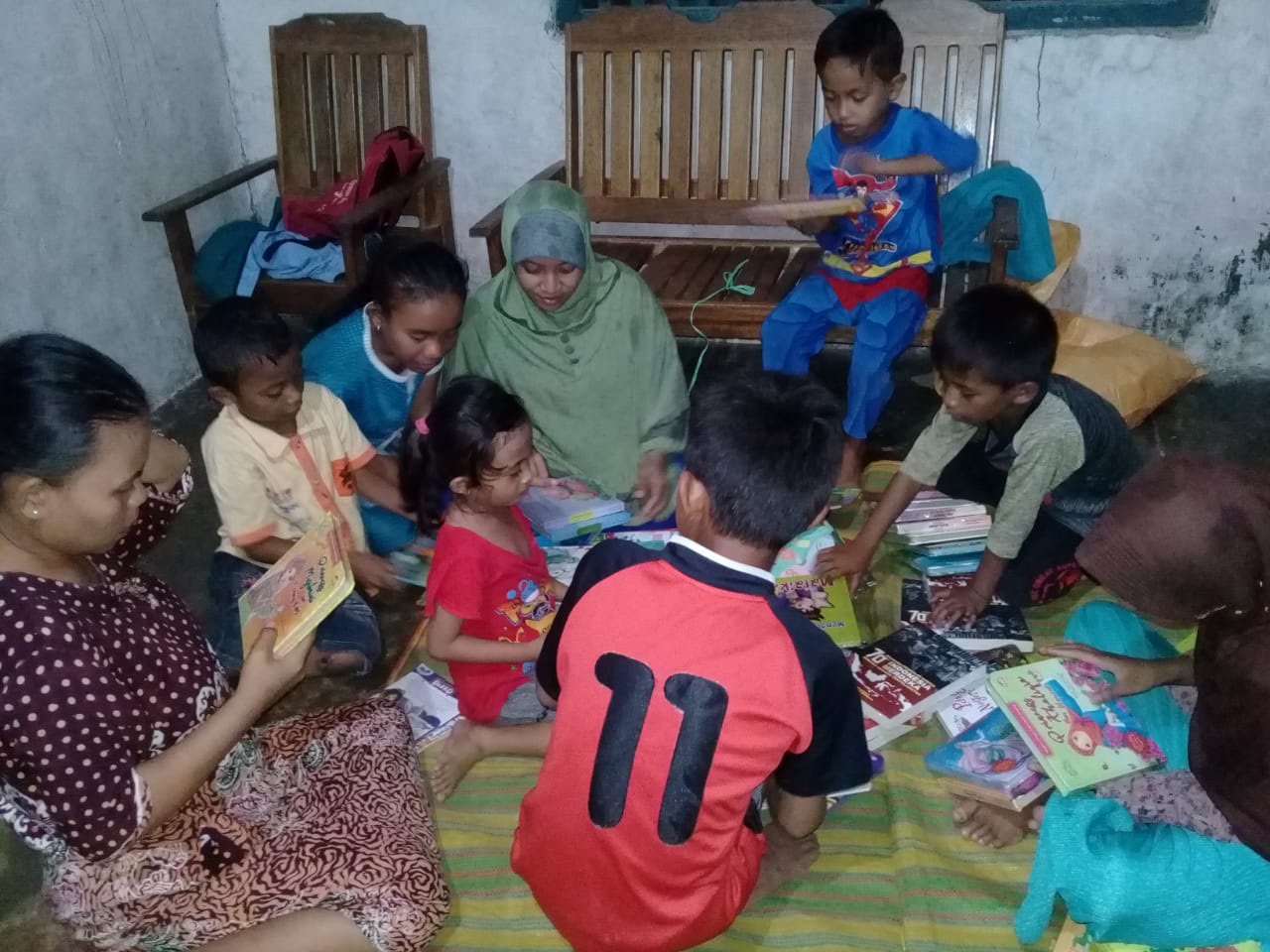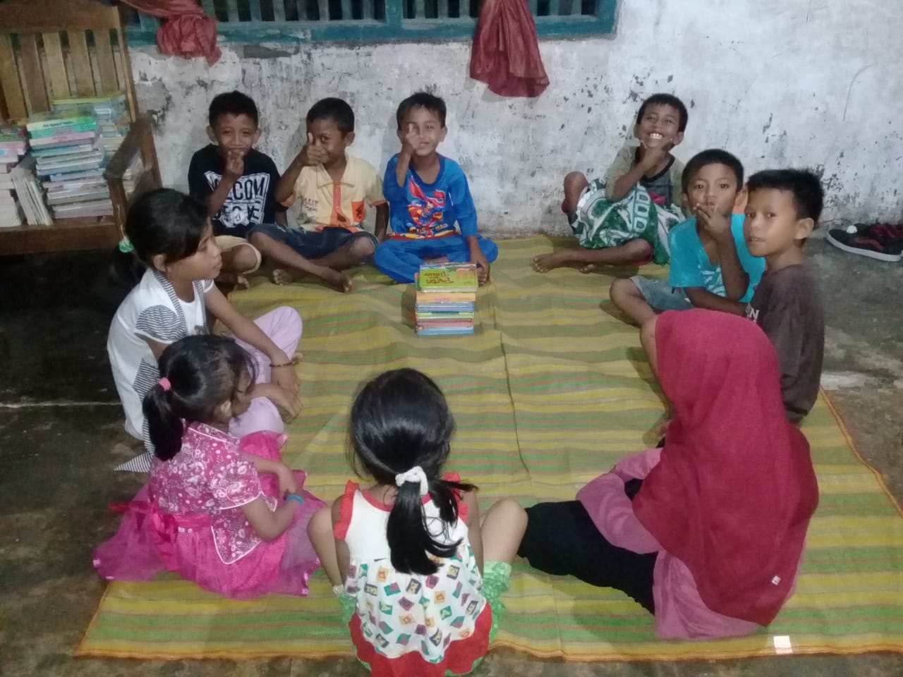Begitu juga pada malam harinya. Puluhan anak pun datang berkunjung ke pojok baca. Mereka seperti bersemangat sekali mau menghabiskan seluruh buku berseri itu. “Bagus cerita ka, gambar-gambarnya juga”; kata Husan dan Husein si kembar dengan menggunakan bahasa daerah kaili.