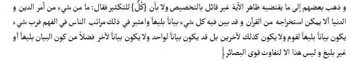 Sebagian ulama berpendapat tentang kandungan lahir ayat …bahwa kata “kullu” bermakna banyak, yaitu mencakup urusan agama dan duniawi, yang tidak memungkinkan mengeluarkannya dari Alquran. Padahal telah dijelaskan di dalamnya segala sesuatu de-ngan penjelasan yang gamblang, karena perbedaan tingkat pemahaman manusia, terkadang jelas untuk suatu kaum dan tidak untuk yang lainnya. Bahkan terkadang jelas bagi seseorang, namun tidak jelas bagi yang lain, baik penjelasannya jelas atau tidak, ini tidak lain dikarenakan perbedaan kekuatan akal.” (8)