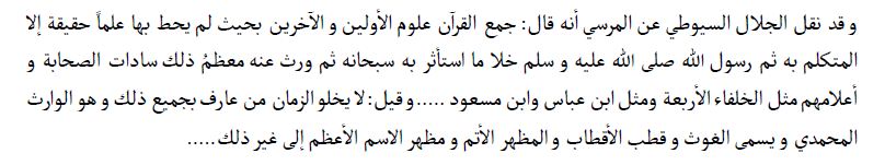 Jalal Al-Din Al-Suyuthi menukil dari Al-Mursi, bahwa dia berkata, “Alquran mengumpulkan ilmu orang terdahulu dan terkemudian, yang tidak dapat menjangkau ilmu hakiki kecuali Allah, kemudian Rasulullah…kemudian diwariskan kepada tokoh sahabat dan orang alim di antara mereka seperti empat khalifah, Ibnu Abbas dan Ibnu Mas’ud… Dikatakan bahwa zaman tidak pernah kosong dari seorang arif dia adalah pewaris Muhammad dan juga disebut Al-Ghauts, Qutb Al-Aqthab, manifestasi yang sempurna, dan manifestasi nama yang agung dan lain-lain…” (9)