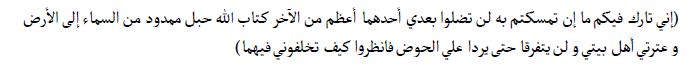 Sesungguhnya aku tinggalkan kepada kalian sesuatu yang jika kalian berpegang kepadanya kalian tidak akan tersesat sepeninggalku, salah satunya lebih besar dari yang lain, yaitu Kitabullah, tali yang terbentang dari langit ke bumi dan ‘Itrahku Ahlulbaitku, keduanya tidak akan pernah berpisah sampai menjumpaiku di telaga, bagaimana kalian memperlakukan keduanya sepeninggalku.”