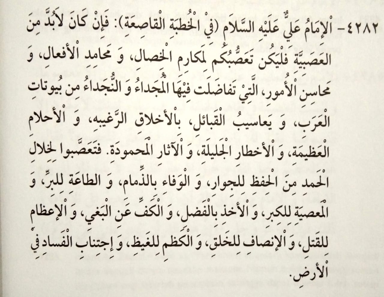 “Jika kalian harus memiliki sikap fanatisme, maka hendaklah kefanatikan kalian untuk sifat-sifat dan tindakan yang terpuji, yang telah menjadi barometer kemuliaan antar suku-suku bangsa Arab satu dengan lainnya. Begitu pula antara seorang pemimpin dengan lainnya, yaitu akhlak yang disenangi, sifat memberi maaf pada kesalahan yang besar. Maka bersikaplah fanatik pada menjaga sifat-sifat terpuji dalam pergaulan bertetangga, memenuhi perjanjian, mematuhi dalam kebaikan, menentang kesombongan, bergegas untuk melakukan keutamaan, menahan diri untuk melakukan perbuatan keji, menganggap besar tindakan pembunuhan, bersikap adil dan konsekuen, menahan amarah dan menjauhkan diri dari segala bentuk tindakan merusak di atas muka bumi.” *