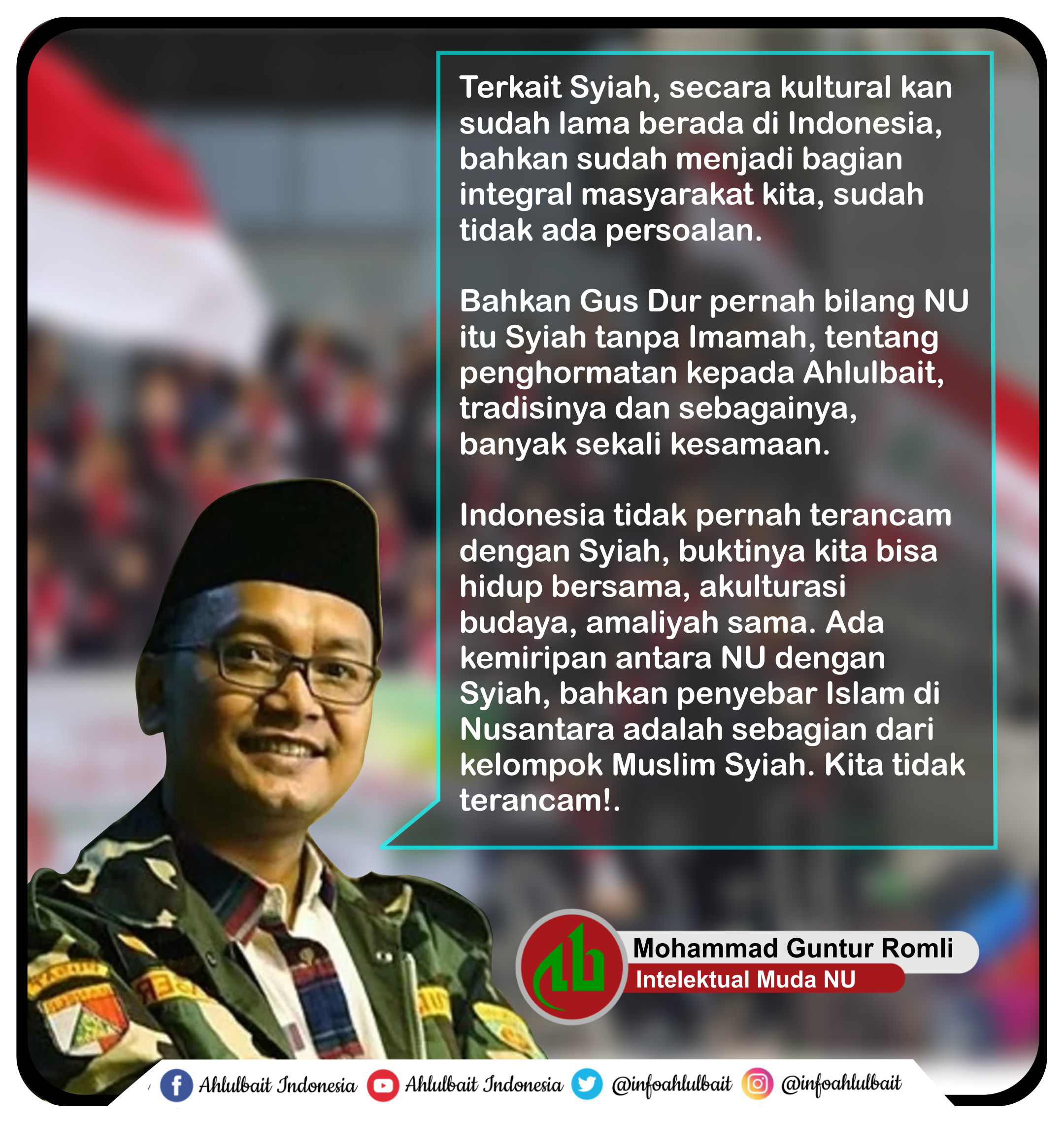 Terkait Syiah, secara kultural kan sudah lama berada di Indonesia, bahkan sudah menjadi bagian integral masyarakat kita, sudah tidak ada persoalan. Bahkan Gus Dur pernah bilang NU itu Syiah tanpa Imamah, tentang penghormatan kepada Ahlulbait, tradisinya dan sebagainya, banyak sekali kesamaan.