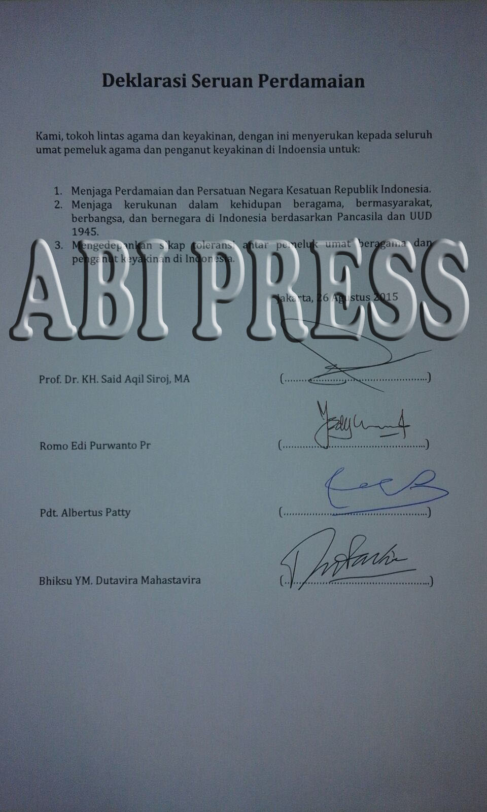 Deklarasi itu ditandatangani empat tokoh lintas agama di antaranya; Prof. Dr. KH. Said Aqil Siradj, MA (Ketua Umum PBNU), Romo Edi Purwanto PR (Konferensi Waligereja Indonesia), Pendeta Albertus Patty (Persekutuan Gereja Indonesia) dan Bhiksu YM  Dutavira Mahastavira (Walubi).