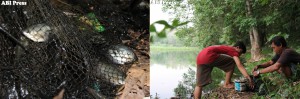 Kami pun memutuskan berhenti sejenak untuk istirahat. Tak berselang lama, tampak  di kejauhan dua orang sedang sibuk mencari ikan. Satu orang melempar jala, dan satunya membawa ember dan drum untuk menaruh ikan tangkapannya. Kami pun mendekat, dan mulai berbincang. “Kita mencari ikan seminggu sekali,“ tutur salah seorang yang bernama Bang Toyib, sambil menarik jala yang beberapa waktu lalu dilempar ke rawa.
