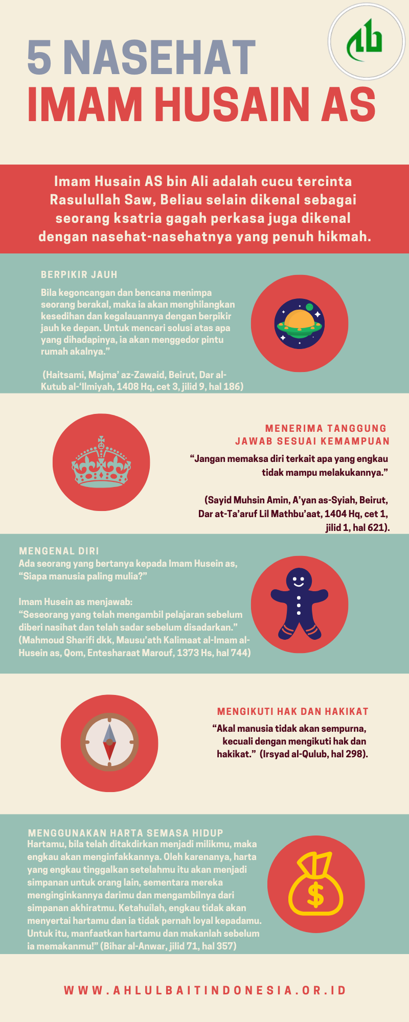 Berita Infografis: 5 Nasehat Imam Husain AS Published 7 tahun ago on 3 Januari, 2019 By Ahlulbait Indonesia Imam Husain AS bin Ali adalah cucu tercinta Rasulullah Saw, Beliau selain dikenal sebagai seorang ksatria gagah perkasa juga dikenal dengan nasehat-nasehatnya yang penuh hikmah. Related Topics: Up Next Khotbah Imam Ali tentang Penciptaan Alam, Malaikat dan Nabi Adam Don't Miss Ahlulbait Indonesia (ABI) Apresiasi Kemah Literasi Sigi Continue Reading You may like Click to comment Leave a Reply Batalkan balasanAlamat email Anda tidak akan dipublikasikan. Ruas yang wajib ditandai *Komentar * Nama * Email * Situs Web