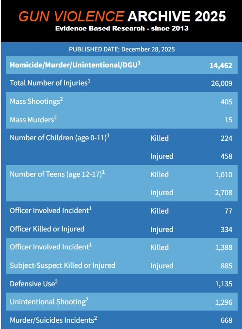 Sepanjang 2025, ribuan orang tewas dan puluhan ribu lainnya terluka akibat kekerasan senjata api. Ratusan di antaranya diklasifikasikan sebagai penembakan massal. Anak-anak dan remaja ikut menanggung konsekuensi dari kebebasan yang terlalu sering disalahartikan sebagai hak tanpa batas untuk memiliki dan menggunakan senjata mematikan.