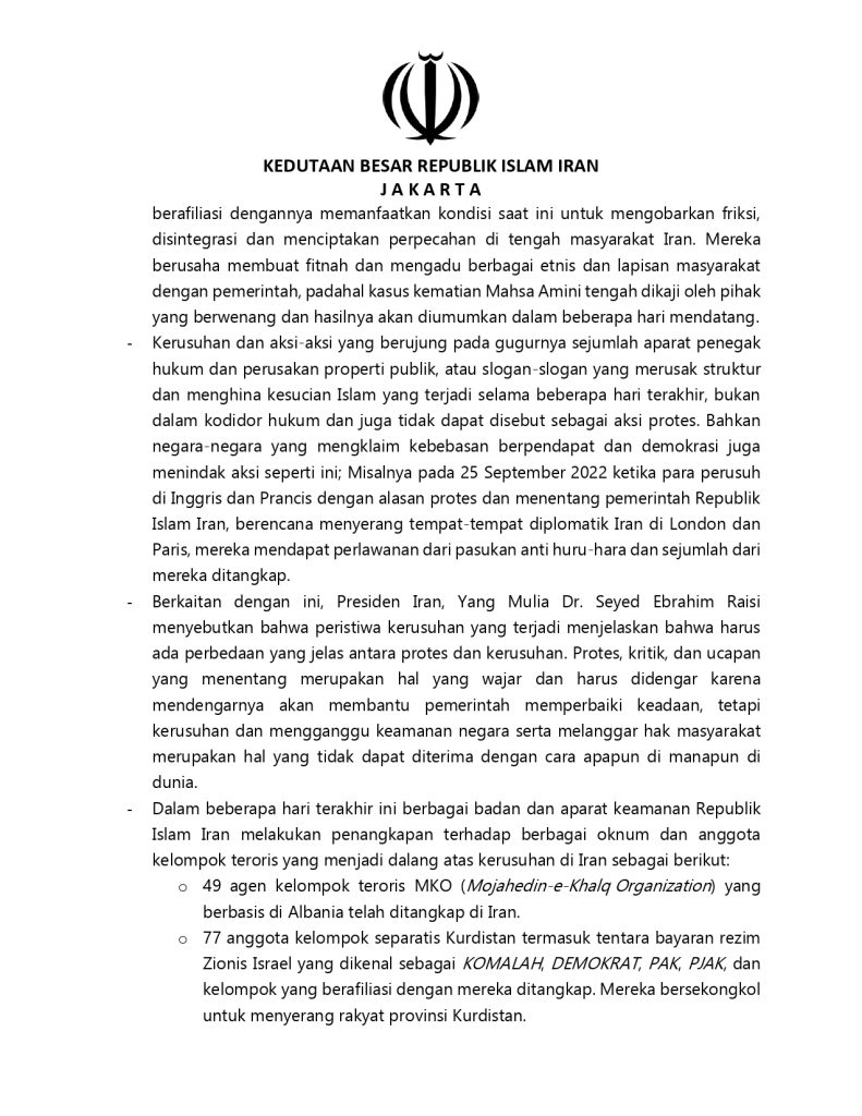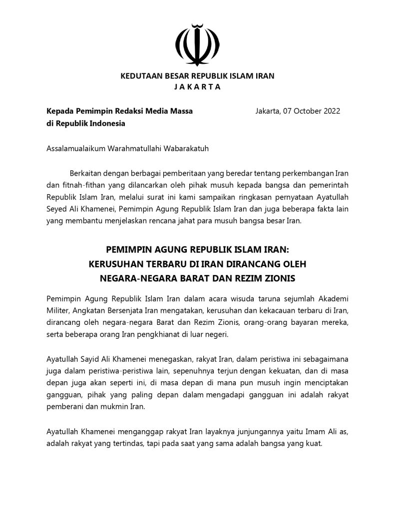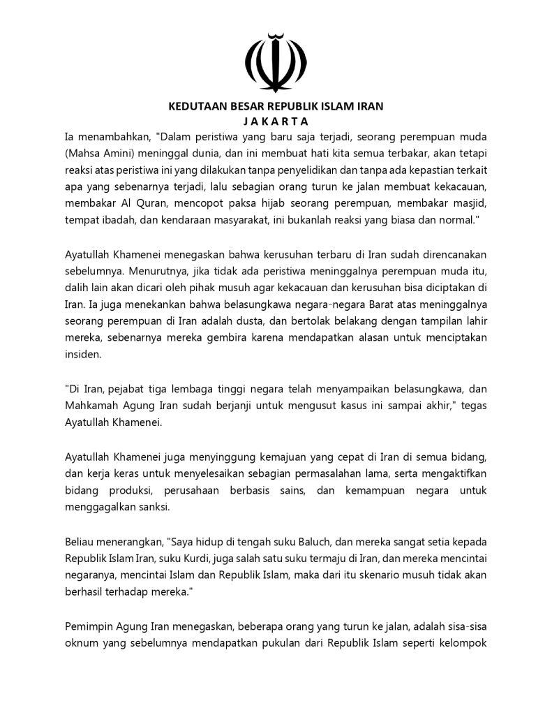 “Di Iran, pejabat tiga lembaga tinggi negara telah menyampaikan belasungkawa, dan Mahkamah Agung Iran sudah berjanji untuk mengusut kasus ini sampai akhir,” tegas Imam.