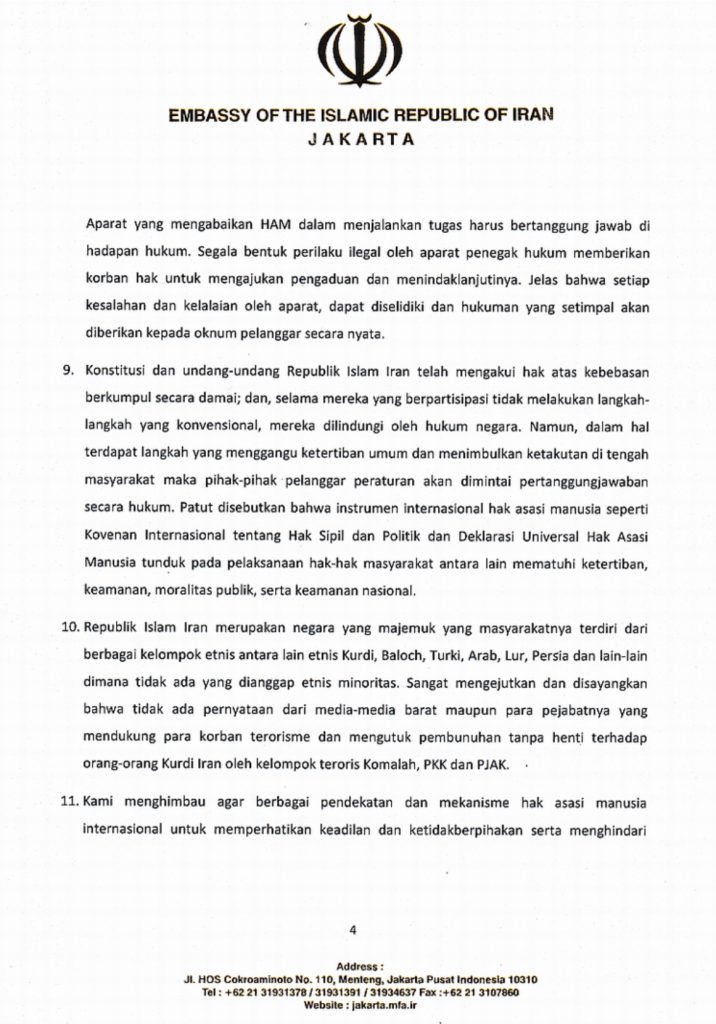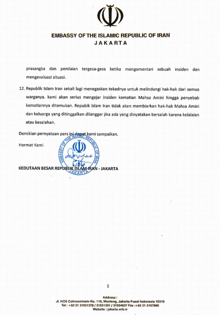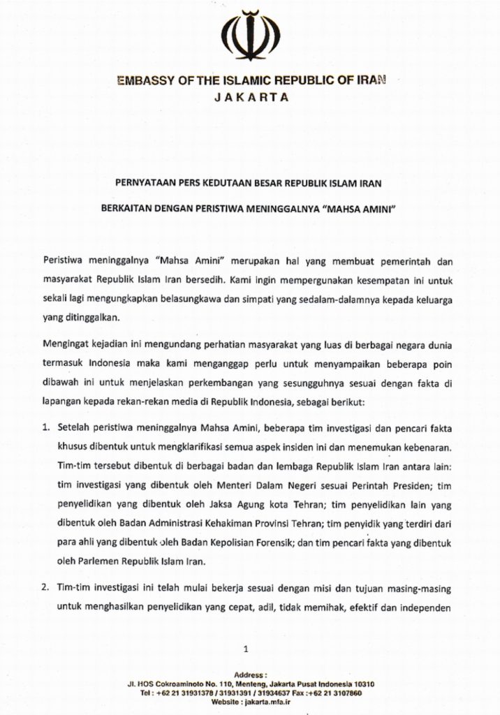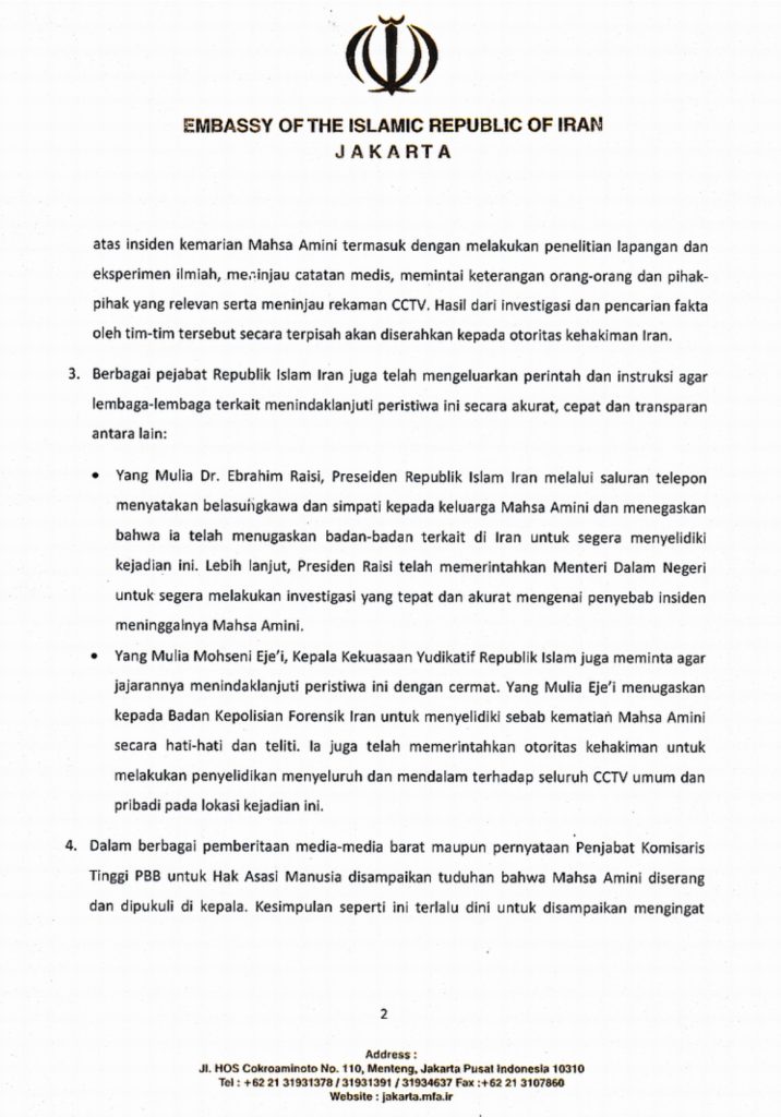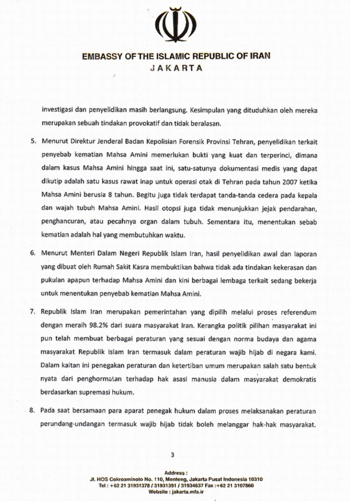 Iran sendiri, menurut rilis tersebut sangat serius menangani kasus Masha Amini ini. Sejumlah tim investigasi dan pencari fakta dibentuk untuk mengungkap fakta meninggalnya Masha Amini.